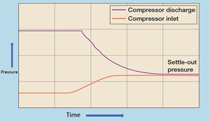 Compressor SOP and its importance. In the case of an unplanned event—such as an emergency shutdown or power failure—the compressor trips first, followed by the anti-surge valve opening (refer to FIG. 1). Thereby, the gas content in the suction side and discharge side mix with each other and are equalized out. This equilibrium pressure throughout the compressor loop is called SOP. FIG. 2 shows a typical time vs. compressor discharge, inlet and SOP while the suction pressure at the settled-out condition reaches higher than normal suction pressure of the machine.