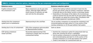 Possible options to minimize methane emissions. TABLE 2 provides emissions reduction options that should be scrutinized, depending on the design of the gas compression system and configuration.