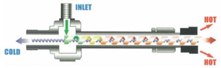 The principal mechanism of the vortex phenomenon is described here. An expanding compressed gas passing the VT tangential nozzles develops into a high-speed rotating body, or a vortex. The gas in the vortex cools as part of its total energy converts into kinetic energy. The angular velocity in the vortex is low at the periphery and very high towards the center. Friction between these zones forces the gas to rotate with the same angular velocity (as in a solid body), thus slowing the inner layers and speeding up the outer layers. As a result, the inner layers lose part of their kinetic energy and their total temperature decreases. The periphery layers receive the energy from the internal layers. This energy converts to heat through friction on the vortex tube walls. The inner (chilled) layers exit the VT through a central orifice in the unit inlet cross section. The outer (warmed) layers are discharged through a valve at a far (hot) end of a VT. This valve is used to adjust the flow proportion (cold flow/inlet flow) and, accordingly, the temperature of the exiting gas flows.