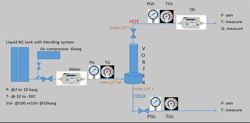 Experimental test setup. The VT test setup, shown in FIG. 2, included a pressurized liquid N₂ tank with a vaporizer, regulating valves to control gas flow and pressure, pressure and temperature gauges, rotameters, and a blending system to achieve and maintain the desired VT inlet gas temperatures and pressures.