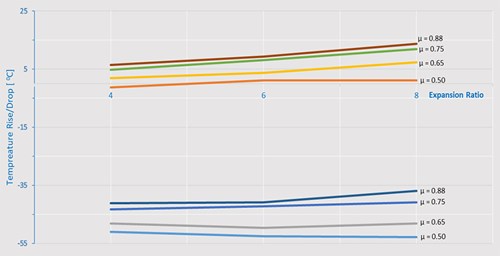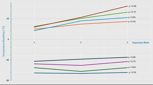 - Flow influence: Greater VT hot outlet flows result in lower temperature differences between the cold and hot outlets. The cold/inlet gas flow rate ratio (µ) also significantly impacts VTa performance. By adjusting the flowrates, the company’s VTa can be fine-tuned to optimize the temperature differential between the cold and hot outlets.