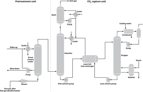 FIG. 3. The most common process for capturing CO2 uses an amine or other organic solvent to trap the gas via an absorber vessel. It can then be stripped out of the liquid in a circular process.