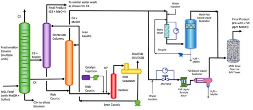 A licensed extractive Merox processa,3 is used to remove mercaptans from the propane and butane streams with an alkaline solution. The process oxidizes the resultant sodium mercaptides into disulfide oil that is then separated out of the regenerated caustic. To conserve capital spending (CAPEX), the propane and butane streams share a common caustic treating and oxidizing Merox unit. A process schematic showing the process is provided in FIG. 2.