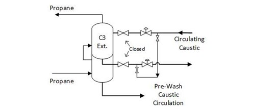 Butane segregation test. To verify that the common caustic stream was transferring methanol from the propane to the butane, a series of plant trials was conducted. On both Train RFS2 and Train RFS3, the propane contactor was isolated from the caustic stream by adding a bypass section of piping, closing the valves on the lean caustic entering the propane contactor and closing the valve on the rich caustic leaving the propane contactor. With this modified process in place, the caustic was only treating the butane and was not exposed to the propane circulating caustic or caustic addition/transfer piping.