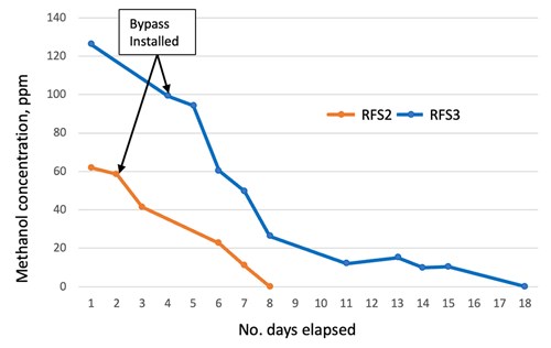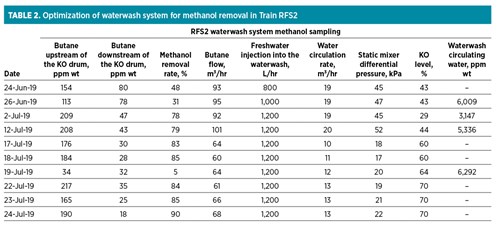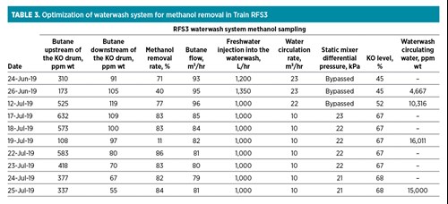 The RFS3 train’s butane waterwash system was modified by taking the static mixer off bypass mode and operating it at an average differential pressure of 22 kPa. The water recirculation rate was lowered from 23 m3/hr to 10 m3/hr, and the KO drum’s water level was increased from an average of 47% to 67%. These changes resulted in the methanol removal performance increasing from 69% to 81%, lowering the methanol concentration in the butane from an average outlet concentration of 105 ppm to 83 ppm. For the RFS3 train, the modifications to the waterwash system were unable to reduce the outlet methanol content to consistently meet the 50-ppm specification.