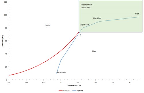 Maintaining operating conditions in the supercritical range, however, is challenging. As the CO2 is transported along pipelines, its pressure and temperature drop rapidly, as depicted in FIG. 3.