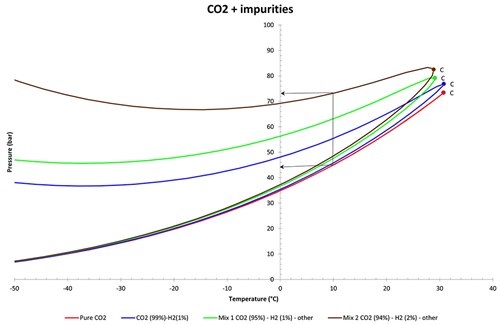 Even small amounts of impurities can significantly shift the critical point and phase behavior of CO, as shown in FIG. 4. In particular, the presence of non-condensable gases such as hydrogen (H2) and nitrogen can alter the bubble and shift the critical pressure by several bars. Therefore, accurately predicting the thermodynamic behavior of the CO2 mixture is important to identify and mitigate the associated risks.