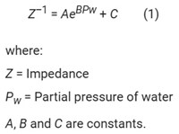 The sensor is excited with a low voltage alternating current at a fixed frequency. The impedance of the sensor relates to the water vapor pressure by the following relationship (Eq. 1):