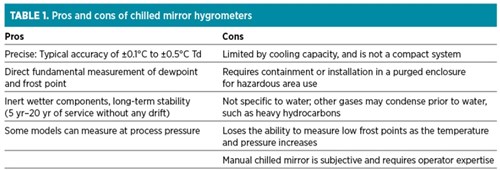 The overall measurement capability of a typical chilled mirror is –80 to > 85°C. The number of thermoelectric cooling stages, auxiliary, governs the full range. This system offers excellent precision and is widely used to provide laboratory reference standards for calibration and metrology applications. However, the footprint and design of most chilled mirror systems means that they have been and are restricted to laboratory applications. Some units on the market can be used for applications in non-hazardous areas, thereby offering the precision and repeatability previously found only in laboratory standard instruments. As a result, these instruments could be used both to calibrate existing impedance-type sensors onsite and as high-accuracy, highly stable humidity sensors. The pros and cons of chilled mirror hygrometers are listed in TABLE 1.
