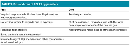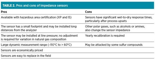 Aluminum oxide sensors have the capability to be installed at high pressures (up to 5,000 psig), and their footprint is quite compact. The sensors, however, are seldom installed directly in the pipeline. Instead, an extraction-type sampling system is utilized, allowing the gas to be filtered, the pressure to be regulated and the flowrate to be controlled. The pros and cons of impedance sensors are listed in TABLE 2.
