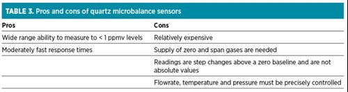 The sensing surface is also susceptible to contamination and must remain clean. A suitable sampling system must be employed. Quartz microbalance analyzers are characterized by having relatively fast response times. The pros and cons of quartz microbalance sensors are detailed in TABLE 3.