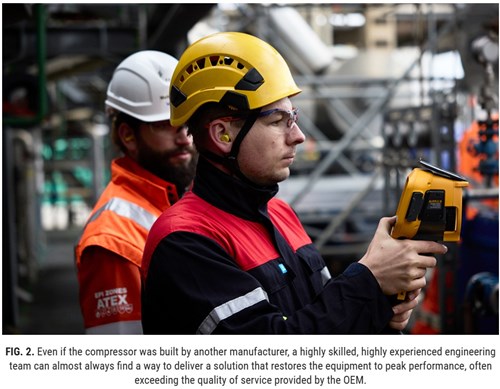 Over time, many businesses face challenges when working with the original equipment manufacturer (OEM) of their compressors. Whether due to poor service, the age of the equipment or a loss of connection with the OEM, companies often seek alternatives for repair and maintenance. However, this move can come with risks of its own, as there is no guarantee that a third party can offer the same level of performance (FIG. 1).