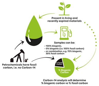 Carbon-14 analysis measures biogenic content. Biogenic content testing measures carbon-14, an isotope present in all living organisms. Petrochemical-derived material no longer contains any carbon-14 content due to its age, as carbon-14 is lost over time via radioactive decay (FIG. 1). Results are reported as a percentage of biogenic content, which reflects the portion of the material produced from renewable feedstocks.1
