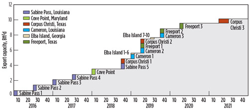According to the US Energy Information Administration (EIA), the US has been the leading natural gas producer globally since 2011. US LNG export capacity will reach 8.9 Bft3d by the end of 2019, according to the EIA, making it the third-largest LNG exporter in the world behind Australia and Qatar. US LNG export capacity ended 2018 at 4.9 Bft3d as two new liquefaction trains became operational (Fig. 1). The growth of the LNG export industry will be defined by export capacity, market potential and political considerations.