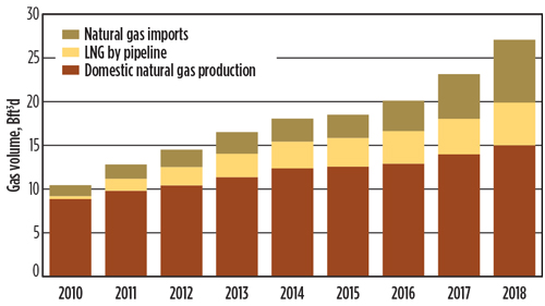| Fig. 1. China’s natural gas production and imports, 2010–2018. Source: U.S. EIA. |
