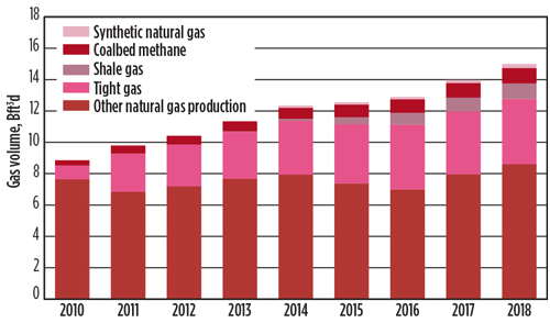 | Fig. 2. China’s natural gas production by type, 2010–2018. Source: U.S. EIA. |