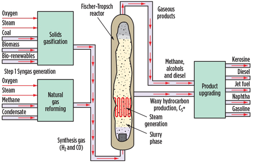 Most existing GTL facilities and projects in development incorporate the Fischer-Tropsch (FT) process (FIG. 1), which involves synthesis gas regeneration, FT conversion and liquid hydrocarbon upgrading. As commercial-scale plants are no longer economical, the GTL market is pushing toward small-scale and modular units. These types of plants can be built at greatly reduced capital cost, which can run into the billions of dollars for large-scale facilities.
