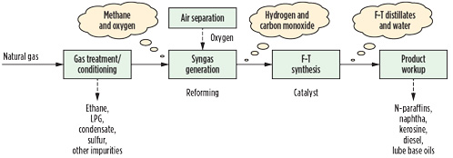 Background on GTL projects. GTL is the conversion of natural gas into liquid products via reforming, synthesis and upgrading processes. The typical GTL product mix focuses on transportation fuels, primarily kerosine and diesel. The GTL production process is shown in Fig. 1.