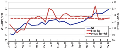 Fig. 3. Rise in crude oil prices vs. Henry Hub gas prices, January 2018–May 2018. |