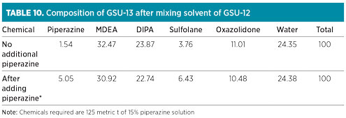 The composition of GSU-13 solution after mixing of GSU-12 solution is shown in Table 10. Fresh chemicals for attaining and maintaining the recommended proportion in GSU-13 were not required for the next 18 mos, due to available buffer stock. However, it was necessary to add piperazine to obtain its concentration proportionate to MDEA in the solvent mix. Approximately 18.75 metric t of piperazine (dry basis), equivalent to 125 metric t of 15% solution, were required for the solvent inventory in GSU-13. Water content was adjusted through the control of steam condensate addition at a 10-metric-tpd/train in both sweetening units. The expected new composition of GSU-13 after adding piperazine is also depicted in Table 10.