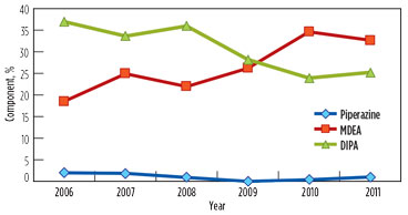 Changes in amine system. After exhausting the DIPA inventory, further solution top-up was carried out with sulfolane, MDEA and piperazine only. The changes in composition of solution in GSU-12 and GSU-13 from 2006–2011 are shown in Table 3 and Table 4, respectively.