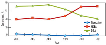 Over the years, the DIPA content in the solution was reduced from 40% to approximately 25% and 21% in GSU-12 and GSU-13, respectively. MDEA content increased from 0% to 33% and 35% in GSU-12 and GSU-13, respectively. Trends of DIPA, MDEA and piperazine in GSU-12 and GSU-13 from 2006–2011 are presented in Fig. 1 and Fig. 2, respectively.