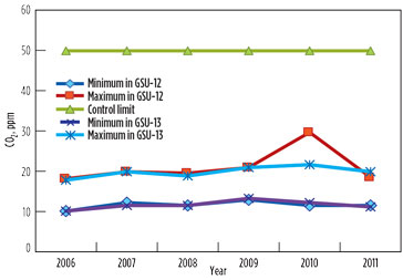 The GSU performances regarding H2S and CO2 concentration in the sweet gas remained satisfactory. The annual average range of CO2 content in sweet gas from both units was found to be within the maximum permissible limit of 50 ppm (Table 5/Fig. 3). The peak value of 30 ppm was observed in 2010 in GSU-12 only. The H2S concentration remained less than 1 ppm—well below the permissible limit of 4 ppm measured consistently in both sweet gas units over the years.