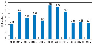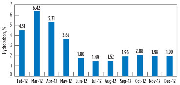 FIG. 7. Variation in the hydrocarbon content in vent gas for GSU-12. |