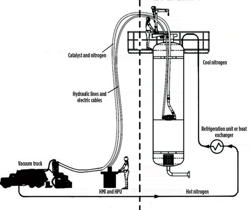 Traditional catalyst unloading. Based on existing technology, a rough estimate of the number of worker days of risk exposure due to confined-space entry during catalyst unloading (Fig. 1) exceeds 10,000 d/yr globally (assuming catalyst removal every 5 yr with an average confined-space entry duration of 1 d per vessel).1 Catalyst removal is commonly achieved by a worker standing on the catalyst and manipulating the end of a high-volume vacuum hose (Fig. 2).