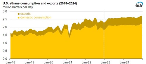 In 2022, U.S. ethane demand increased by approximately 9%, or almost 0.2 MMbpd, according to the U.S. EIA's Petroleum Supply Monthly. U.S. production and consumption of ethane (a hydrocarbon gas liquid used almost exclusively as a feedstock in the petrochemical industry) has grown since 2010, along with the build-out of U.S. petrochemical capacity. U.S. ethane product supplied, a proxy for ethane consumption, averaged just under 2 MMbpd in 2022, reaching a peak of almost 2.2 MMbpd in July.
