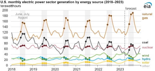 Natural gas remains the primary source of generation in the electric power sector, and we expect U.S. natural gas-fired generation will grow by 3%, or 16.7 terawatt hours (TWh), this summer compared with last year. Additional natural gas-fired generating capacity and favorable fuel costs are the primary drivers of our forecast increase in generation from natural gas this summer.