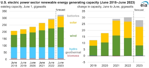 A large share of the new generating capacity built in the United States over the past few years is powered by solar or wind. The U.S. electric power sector added an estimated 14.5 gigawatts (GW) of solar generating capacity and about 8.0 GW of wind capacity during the 12 months ending May 31, 2023.