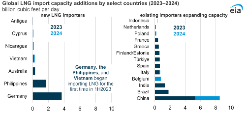 Europe: LNG regasification capacity is set to expand by one-third by the end of 2024 compared with 2022 in response to reduced natural gas imports by pipeline from Russia. Germany began importing LNG this year as operators fast-tracked construction of regasification capacity by using Floating Storage and Regasification Units (FSRUs). Three new terminals are online, and three more terminals are under construction and are expected to be online by the end of 2023. These terminals have a combined regasification capacity of 3.7 Bcf/d. Eleven other countries will each add between 0.1 Bcf/d and 0.7 Bcf/d of new or expanded regasification capacity for a combined 4.9 Bcf/d of additions. Cyprus is also expected to start importing LNG in 2024.