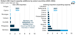 Global liquefied natural gas (LNG) import capacity is set to expand by 16%, or 23 billion cubic feet per day (Bcf/d), by the end of 2024 compared with 2022. Our estimate is based on trade press and data by the International Group of Liquefied Natural Gas Importers (GIIGNL). In the first seven months of 2023, three countries—Germany, the Philippines, and Vietnam—began importing LNG for the first time. By the end of next year, we expect Antigua, Australia, Cyprus, and Nicaragua to start importing LNG. Several more countries are in advanced stages of developing LNG import capacity.