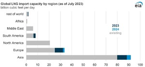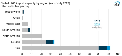 Regionally, we expect Asia to lead the growth in global regasification capacity, accounting for 52% (11.9 Bcf/d) of the total capacity additions in 2023 and 2024. Europe accounts for 38% (8.6 Bcf/d), and the rest of the world accounts for 10% (2.3 Bcf/d).
