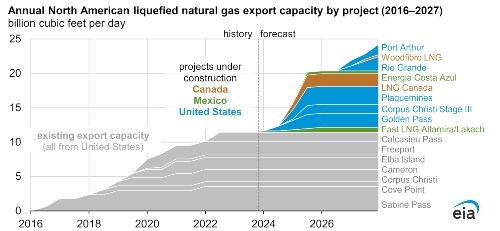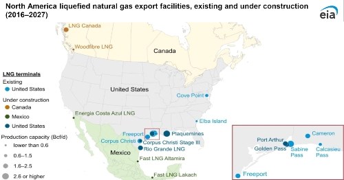 We expect North America’s liquefied natural gas (LNG) export capacity to expand to 24.3 billion cubic feet per day (Bcf/d) from 11.4 Bcf/d today as Mexico and Canada place their first LNG export terminals into service and the United States adds to its existing LNG capacity. By the end of 2027, we estimate LNG export capacity will grow by 1.1 Bcf/d in Mexico, 2.1 Bcf/d in Canada, and 9.7 Bcf/d in the United States from a total of 10 new projects across the three countries.