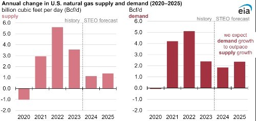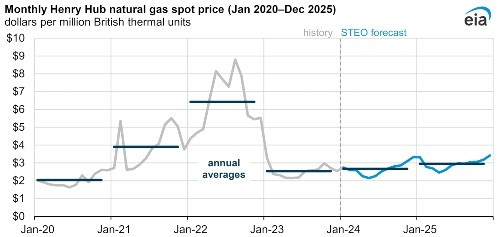 EIA expect the U.S. benchmark natural gas spot price at the Henry Hub to average under $3.00 per million British thermal units (MMBtu) in 2024 and 2025 in our January Short-Term Energy Outlook (STEO). The annual average Henry Hub prices in 2024 and 2025 increase from 2023 in our forecast because we expect natural gas demand growth to outpace natural gas supply growth. Despite increased demand, our forecast prices for 2024 and 2025 are less than half the annual average price in 2022 and are only slightly higher than the $2.54/MMBtu we reported for 2023.