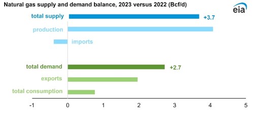 Overall, natural gas demand increased by 3% in 2023 compared with 2022. Increased exports and a slight increase in natural gas consumed for electricity generation offset lower residential and commercial sector consumption. Liquefied natural gas exports rose 12% in 2023 compared with 2022, and natural gas exports by pipeline increased 9% over the same period.