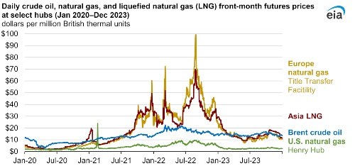 Natural gas prices at the Title Transfer Facility (TTF) in the Netherlands—a large natural gas trading hub in Europe—started to increase in the second half of 2021, and by 2022, averaged $40.30 per million British thermal units (MMBtu) annually. TTF prices reached nearly $100.00/MMBtu in August 2022, significantly higher than the 2019–20 average of $3.86/MMBtu amid concerns over natural gas supplies for the winter given the uncertainty over the future of piped natural gas from Russia. In January 2023, however, TTF prices began to decline from a monthly average of $20.43/MMBtu to $10.06/MMBtu by May as natural gas balances in Europe continued to improve. From June 2023 through the end of the year, TTF prices averaged $11.89/MMBtu, falling below LNG prices in East Asia.