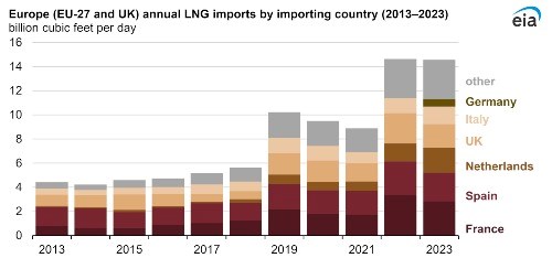 In 2023, France, Spain, the Netherlands, and the UK combined accounted for almost two-thirds (9.3 Bcf/d) of Europe’s total LNG imports. Germany imported its first LNG in January 2023 and ended the year accounting for 4% (0.6 Bcf/d) of Europe’s total imports. The United States supplied more than 80% of Germany’s LNG imports.