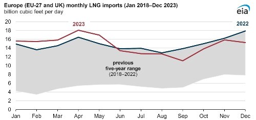 In 2023, Europe’s LNG imports averaged 14.7 Bcf/d, essentially unchanged from 2022, despite an estimated 4.2 Bcf/d of regasification capacity additions. Mild 2022–23 winter weather in the Northern Hemisphere reduced heating demand and contributed to Europe ending the winter heating season with record-high natural gas in storage. LNG imports into Europe established new records from June 2022 through April 2023, when imports peaked at 18.1 Bcf/d. Imports then declined in subsequent months because storage inventories were full, international LNG prices were relatively high, and energy conservation measures significantly reduced natural gas consumption.