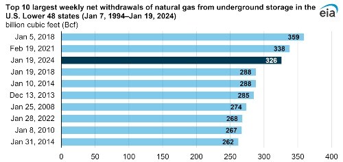 Natural gas was also withdrawn from underground storage at close to record volumes to meet the increased heating and electricity consumption during the cold snap. Weekly net withdrawals of natural gas from underground storage in the L48 for the week of Saturday, January 13, through Friday, January 19, totaled 326 Bcf, the third-most for any week on record, according to our Weekly Natural Gas Storage Report.