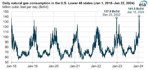 On January 16, 2024, a record high of 141.5 billion cubic feet (Bcf) of natural gas was consumed in the U.S. Lower 48 states (L48), exceeding the previous record set on December 23, 2022, according to estimates from S&P Global Commodity Insights. Well-below-normal temperatures caused by a large mass of arctic air that covered most of the continental United States increased demand of natural gas used for residential and commercial space heating and for electric power generation. Both consumption of natural gas and withdrawals from underground storage increased to record volumes because of the higher demand.