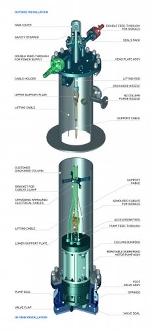 In contrast to the ARTIKA Series, which is mounted directly at the bottom of the tank or inside a cryostat, the ESK-IMO retractable pump is installed inside a column that is isolated from the rest of the tank by a foot valve. In this way, the liquefied natural gas remains confined in the tank outside the column, allowing the pump to be removed by opening a cover at the top of the column.