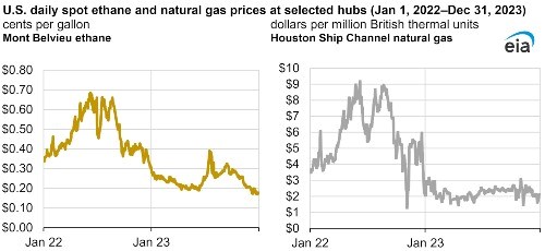 U.S. ethane prices at Mont Belvieu, Texas, the main pricing hub for NGPLs, were volatile throughout 2023. Ethane prices averaged under 25 cents per gallon (gal) for the year but briefly rose close to 39 cents/gal ($5.89 per million British thermal units) in mid-July. Ethane prices fell below 18 cents/gal in the last week of the year due to lower natural gas prices. When ethane prices are low relative to natural gas prices, plant operators can leave more ethane in the natural gas stream to be sold in natural gas markets.
