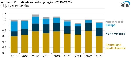 Distillate fuel has been the second-highest U.S. petroleum product export since 2020, after propane. In 2023, U.S. exports of distillate fuel oil decreased by 8% to 1.1 million b/d. The United States typically exports more distillate fuel to Central America and South America than to any other region, which was true in 2023, when the region accounted for 54% of all U.S. distillate exports. Despite the region’s top ranking, U.S. exports of distillate to the region were 23% lower in 2023 compared with 2022, decreasing to 602,000 b/d, the lowest since 2015. Mexico remained the top destination country in 2023, when U.S. exports of distillate averaged 291,000 b/d.