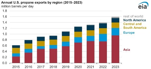 Annual U.S. propane exports to Asia rose 27% (204,000 b/d) in 2023 compared with 2022. Most U.S. propane exports to Asia went to Japan, South Korea, and China. China accounted for the most growth in U.S. propane exports to Asia, increasing by 50% (72,000 b/d) in 2023.