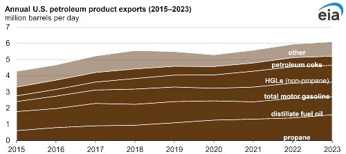 Petroleum product exports from the United States averaged a record 6.1 million barrels per day (b/d) in 2023, a 2.5% increase from 2022, according to our Petroleum Supply Monthly. Propane drove the growth in U.S. petroleum product exports, offsetting decreases in gasoline and distillate exports.