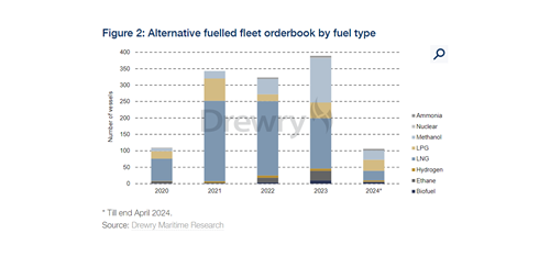 There are 523 LNG-fuelled vessels in service (excluding LNG carriers), which account for 0.5% of the global fleet. However, 560 LNG-fuelled vessels are on order which constitute 57% of the alternative-fuelled fleet on order.