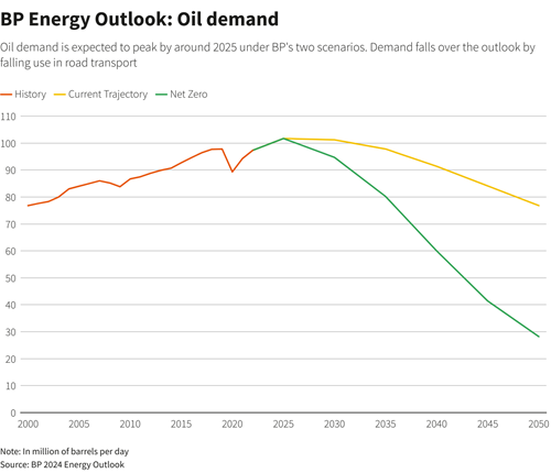 Oil. Oil demand is expected to peak by 2025 at around 102 MMbpd under both scenarios. However, it declines at a different pace in either outlook, driven primarily by the pace of falling oil use in road transport.